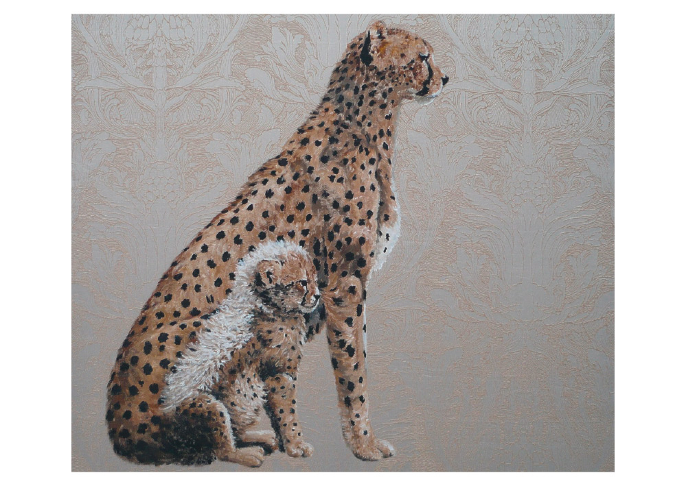 In meiner Malerei geht es um Tiere. Zur Zeit erobern sie sich ihren Lebensraum auf „Omas Sofastoffen“, der vorgefundene Dekor wird zur Landschaft.